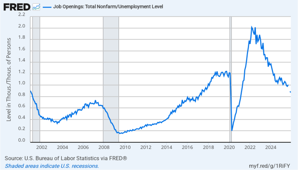 The BLS was scheduled to release its monthly “Employment Situation” report (often called the “jobs report”) for January 2026 tomorrow. Because of the temporary lapse in funding that began Saturday, the report will instead be released next Wednesday, February 11. That report will provide additional data on the state of the labor market. (Note that the data in the JOLTS report lag the data in the “Employment Situation” report by one month.)