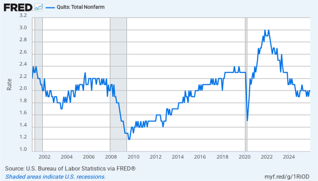 The rate at which workers are willing to quit their jobs is an indication of how they perceive the ease of finding a new job. As the following figure shows, the quit rate declined slowly from a peak of 3 percent in late 2021 and early 2022 to 2.0 percent in August 2024, the same value as in December 2025. That rate is below the rate during 2019 and early 2020. By this measure, workers’ perceptions of the state of the labor market have remained remarkably stable over the last year and a half.