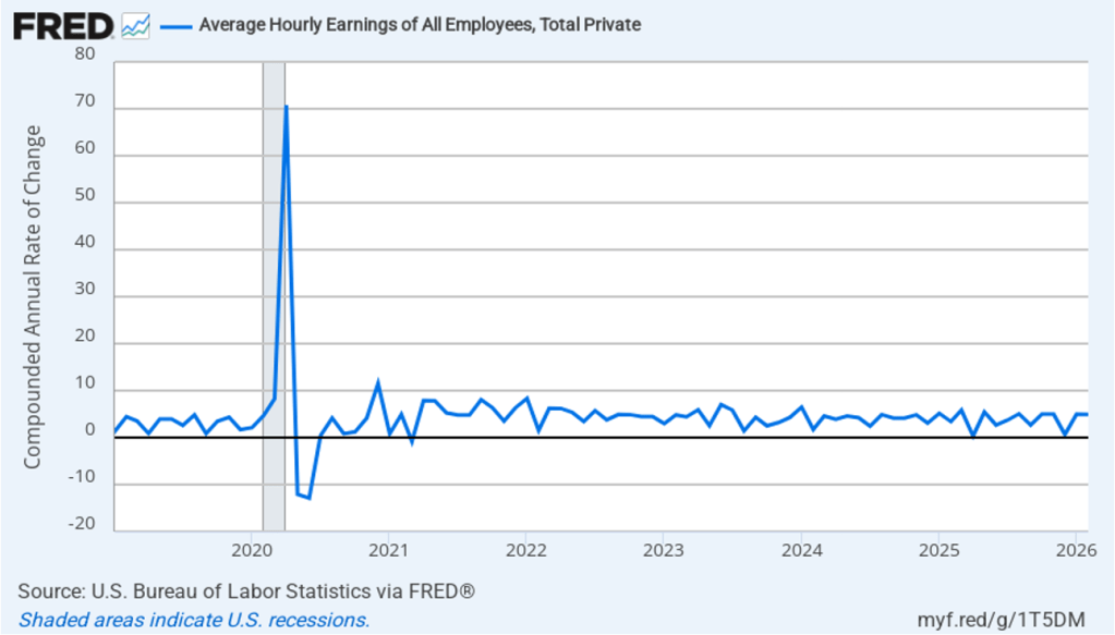 The following figure shows wage inflation calculated by compounding the current month’s rate over an entire year. (The figure above shows what is sometimes called 12-month wage inflation, whereas this figure shows 1-month wage inflation.) One-month wage inflation is much more volatile than 12-month wage inflation—note the very large swings in 1-month wage inflation in April and May 2020 during the business closures caused by the Covid pandemic. In February, the 1-month rate of wage inflation was 5.0 percent, unchanged from January. This high rate of wage growth is surprising given the decline in employment. But two month’s data from such a volatile series may not accurately reflect longer-run trends in wage inflation.