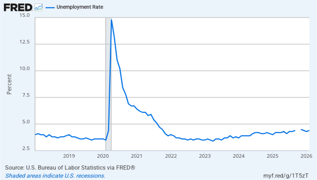 The unemployment rate, which is calculated from data in the household survey, increased to 4.4 percent in February for 4.3 percent in January. As the following figure shows, the unemployment rate has been remarkably stable over the past year and a half, staying between 4.0 percent and 4.4 percent in each month since May 2024. The Federal Open Market Committee’s current estimate of the natural rate of unemployment—the normal rate of unemployment over the long run—is 4.2 percent. So, unemployment is slightly above that estimate of the natural rate. (We discuss the natural rate of unemployment in Macroeconomics, Chapter 9 and Economics, Chapter 19.)