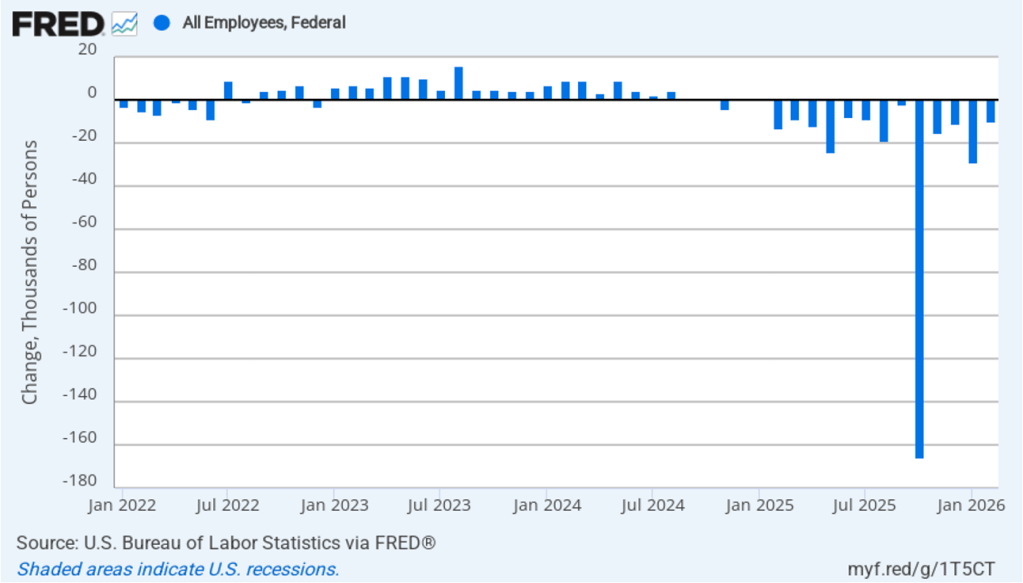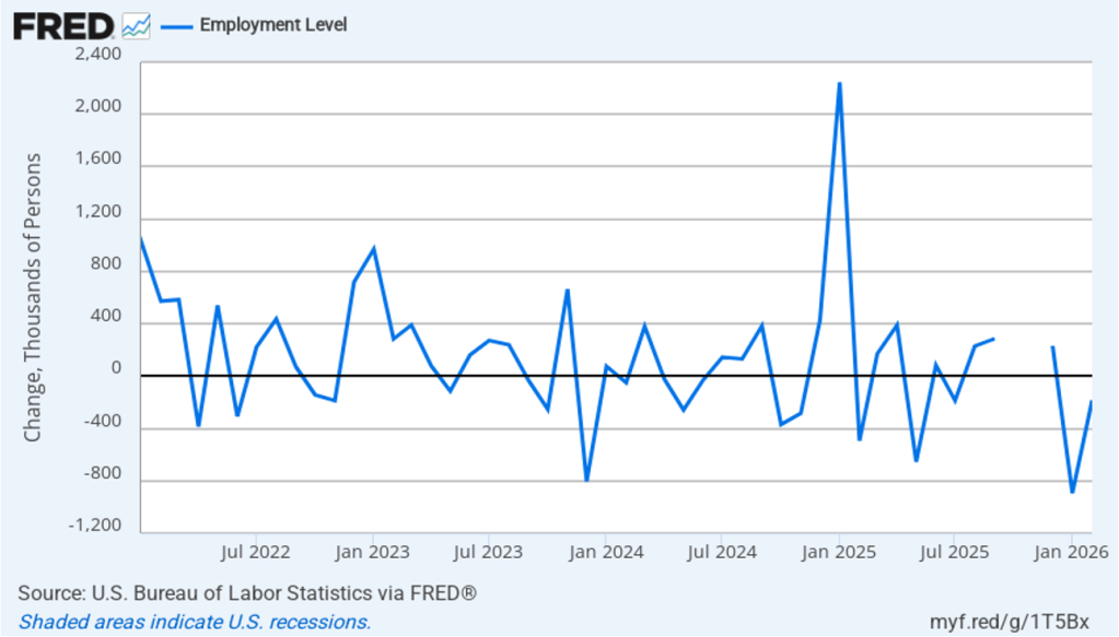 This morning (March 6), the Bureau of Labor Statistics (BLS) released its “Employment Situation” report (often called the “jobs report”) for February. The jobs report for January showed a much stronger than expected increase in employment. Today’s report was a surprise in the opposite direction with employment unexpectedly declining.