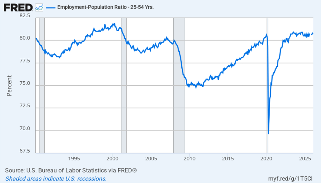 The household survey has another important labor market indicator: the employment-population ratio for prime age workers—those workers aged 25 to 54. In February the ratio was 80.7 percent, down slightly from 80.8 percent in January. The prime-age population ratio remains above its value for most of the period since 2001. The continued high levels of the prime-age employment-population ratio indicate some continuing strength in the labor market.