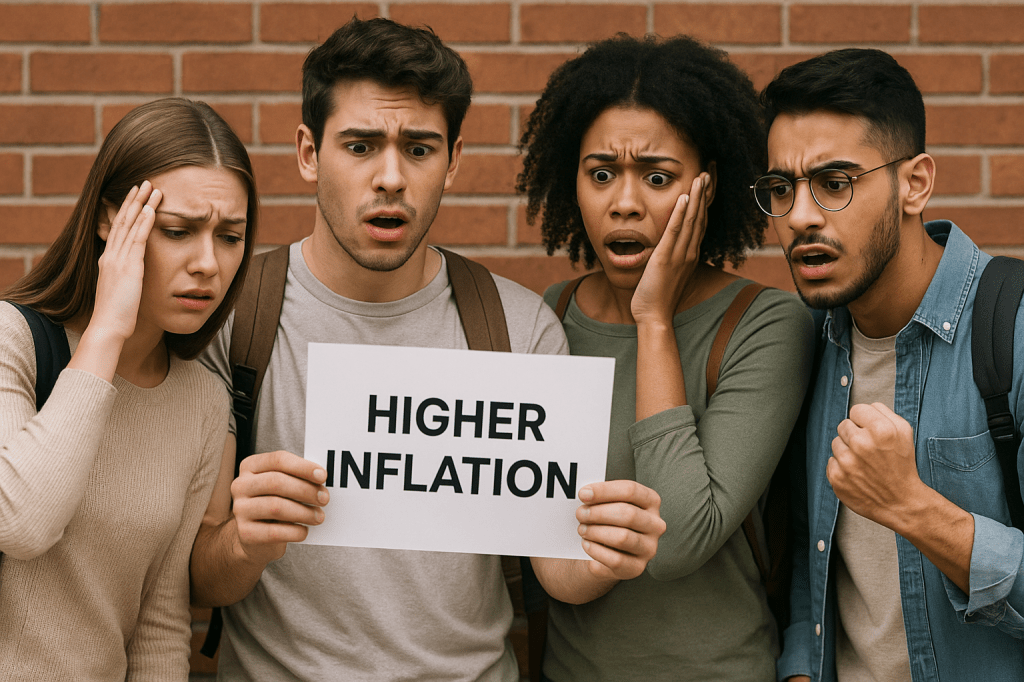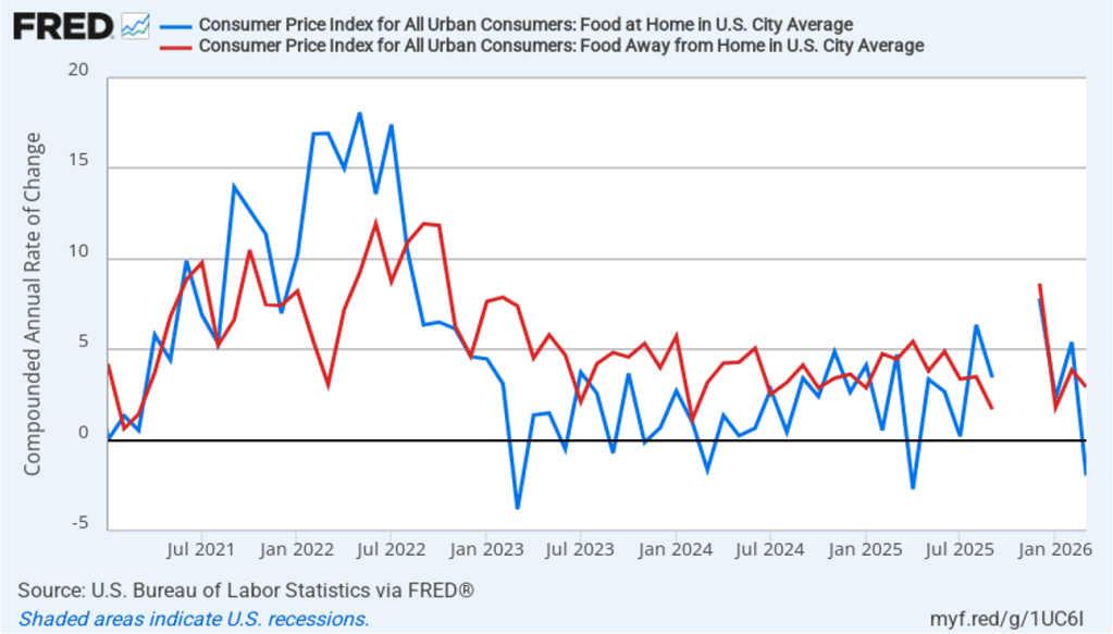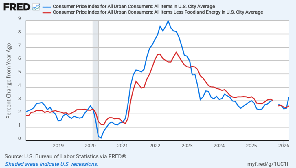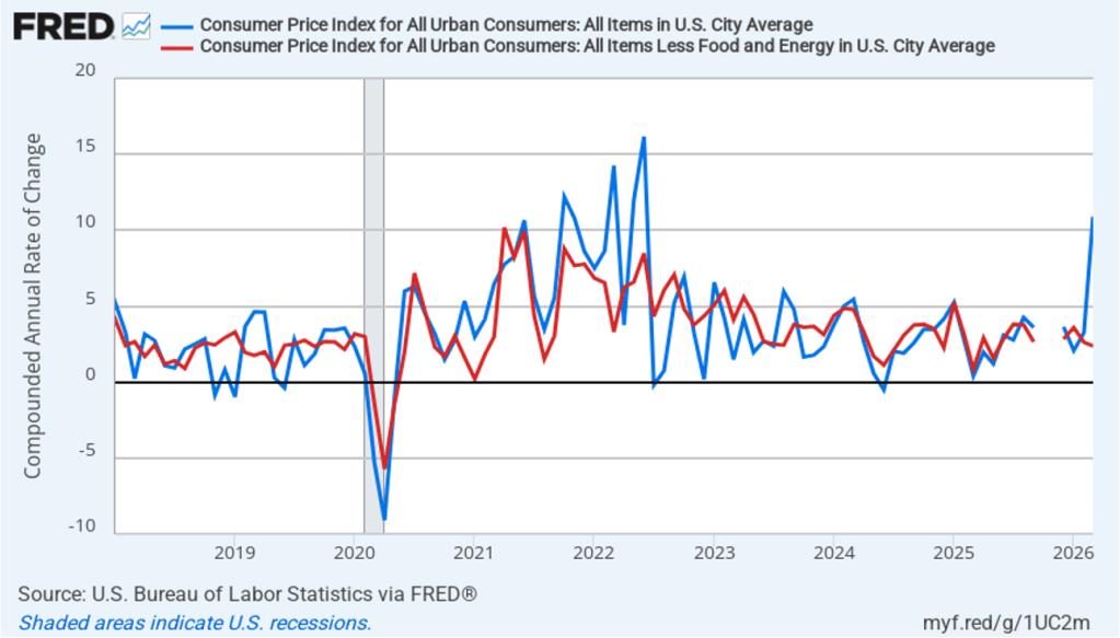 CPI Inflation jumped to a level well above the Federal Reserve’s 2 percent annual inflation target. The following figure compares headline CPI inflation (the blue line) and core CPI inflation (the red line). Because of the effects of the federal government shutdown, the BLS didn’t report inflation rates for October or November, so both lines show gaps for those months.