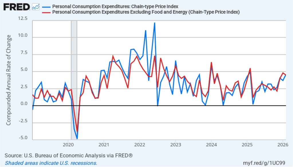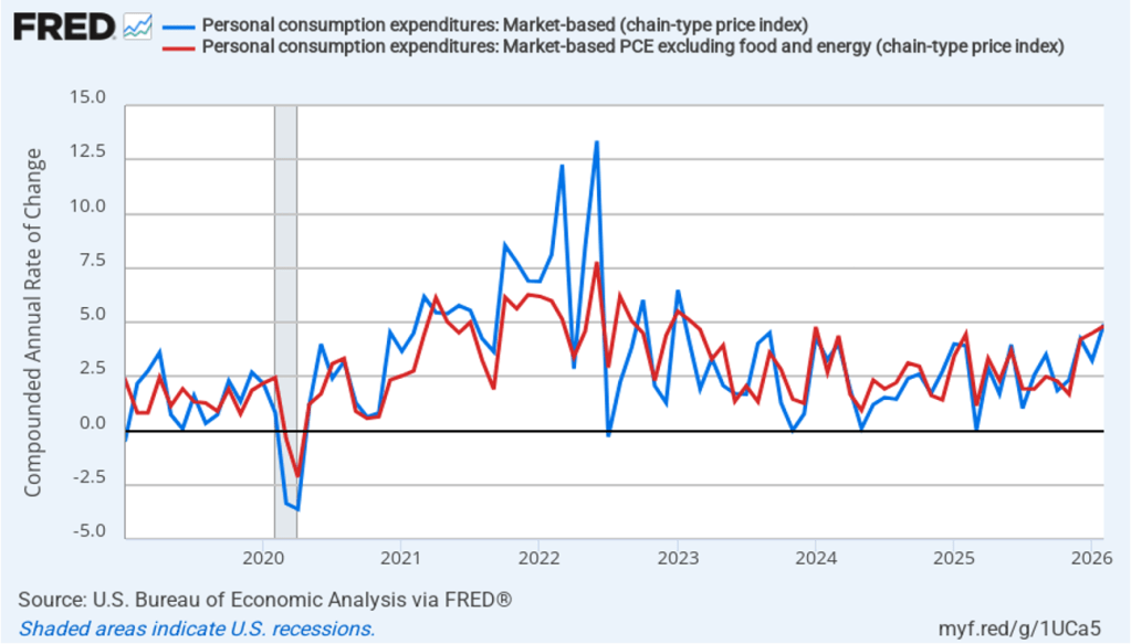 This morning, the Bureau of Labor Statistics (BLS) released its report on the consumer price index (CPI) for March. Yesterday, the Bureau of Economic Analysis (BEA) released monthly data on the personal consumption expenditures (PCE) price index for February as part of its “Personal Income and Outlays” report. Both reports showed that the inflation has worsened. Note that data for the PCE were collected before the beginning of the conflict with Iran.