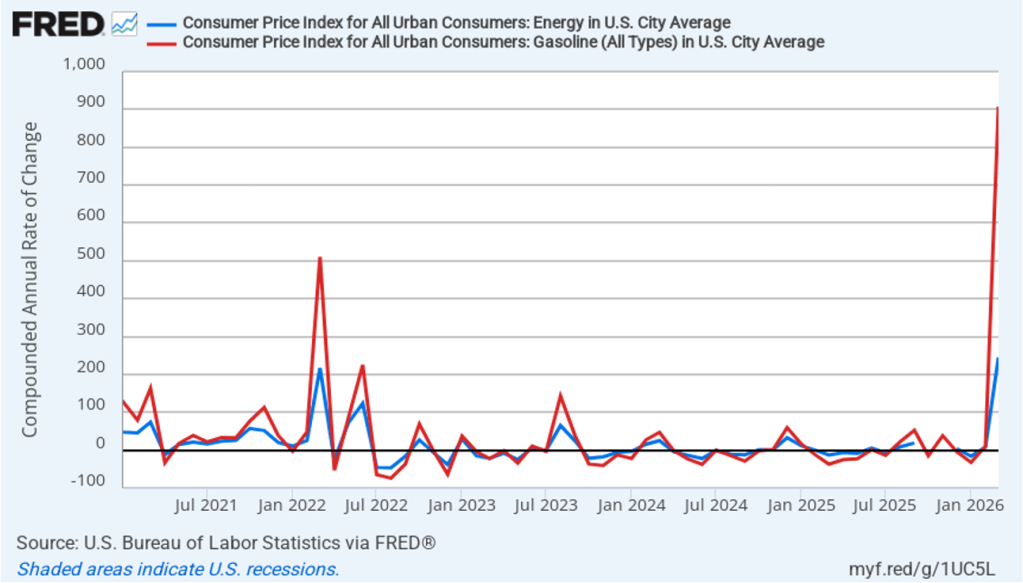 The following figure emphasizes the role paid by energy prices in causing the jump in inflation. The blue line shows the 1-month inflation rate in all energy prices included in the CPI. The red line shows the 1-month inflation rate in gasoline prices—which was an astounding 907.4 percent.