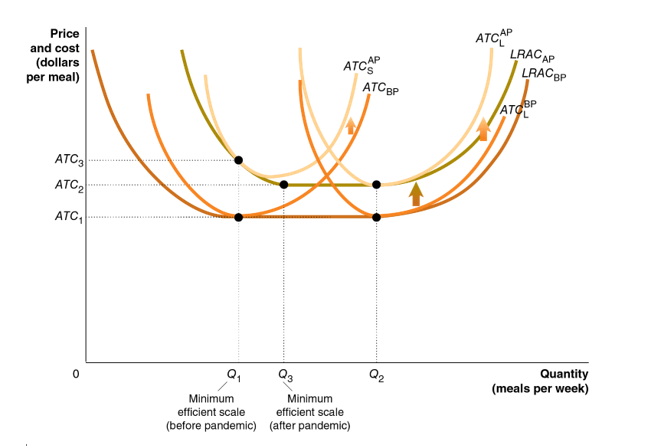 Also notice that before the pandemic, serving Q1 meals per week was the minimum efficient scale for a restaurant.  Minimum efficient scale is the level of output at which all economies of scale are exhausted.  The pandemic increases the costs of the small restaurant from  to is , and the costs of the large restaurant from to .  Minimum efficient scale increases to Q3, which is more meals per week than a small restaurant can sell. As a result, the average total cost of small restaurant increases to ATC3. A larger restaurant is still selling a quantity of meals that is beyond minimum efficient scale, so its average cost only rises to ATC2.  With higher average costs, smaller restaurants are less able to successfully compete with larger restaurants.