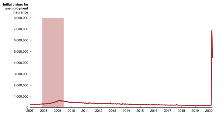 When workers lose their jobs, they are usually eligible for unemployment insurance payments. State governments are responsible for funding the payments, although the federal government provides guidelines states must meet and contributes funds to pay for administering the program.  As the following figure shows, the U.S. experienced an extraordinary surge in weekly unemployment insurance claims during April 2020. The increase in claims was much greater than occurred at any point during the Great Recession of 2007-2009, which was the most severe recession the U.S. economy had experienced since the Great Depression of the 1930s.