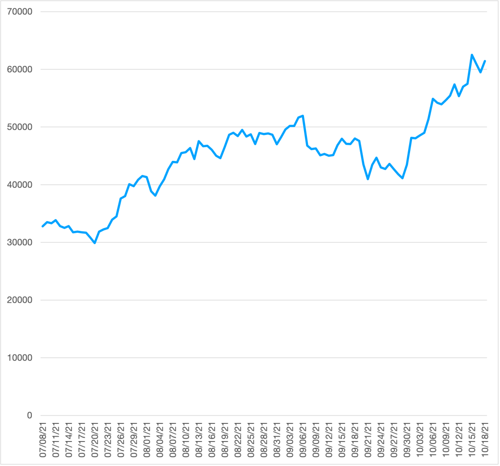 In practice, though, swings in the value of bitcoin have been much too large to make it a good substitute for cash, checks, or credit cards in everyday transactions. For instance, at the beginning of 2015, one bitcoin was worth about $300. Over the following five years, the price of bitcoin rose as high at $17,000 before falling to about $8,000 at the beginning of 2020. During 2021, the volatility of bitcoin prices increased, rising as high as $62,000 in April and falling as low as $30,000 in July before rising back above $60,000 in October. (The following chart shows movements in the price of bitcoin from early July to mid-October 2021; the vertical axis shows the price as dollars per bitcoin.)