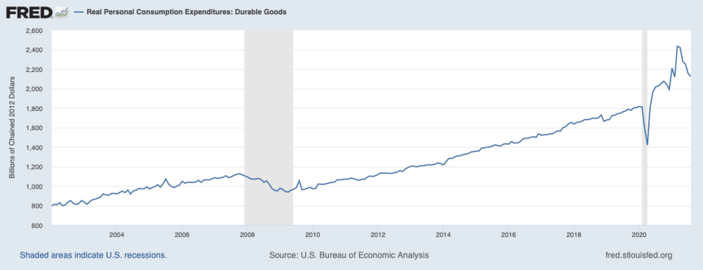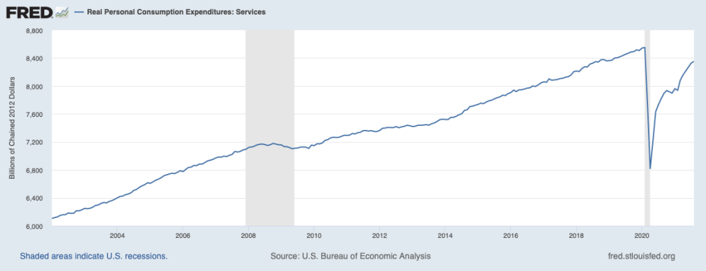 But, as we discuss in the chapter, the recovery from the 2020 recession was unusually rapid, although uneven. Many services industries, such as restaurants, gyms, and movie theaters continued to struggle well into 2021 as firms had difficulty attracting workers and as some consumers remained reluctant to spend time inside in close contact with other people. In contrast, consumer spending on durable goods was far above its pre-pandemic level, as well as being above the rate at which it had been growing during the years before the pandemic. The two graphs below show real consumer spending on durables and on services up through August 2021.