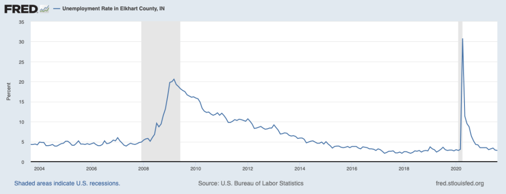 For example, during the Great Recession of 2007-2009, the unemployment rate in the country rose from a low of 3.9 percent in May 2007 to a high of 20 percent in March 2009, before declining during the following economic recovery.  Just before the start of the Covid-19 recession of 2020, the unemployment rate in Elkhart was 2.8 percent. It then soared to 30.8 percent in April.