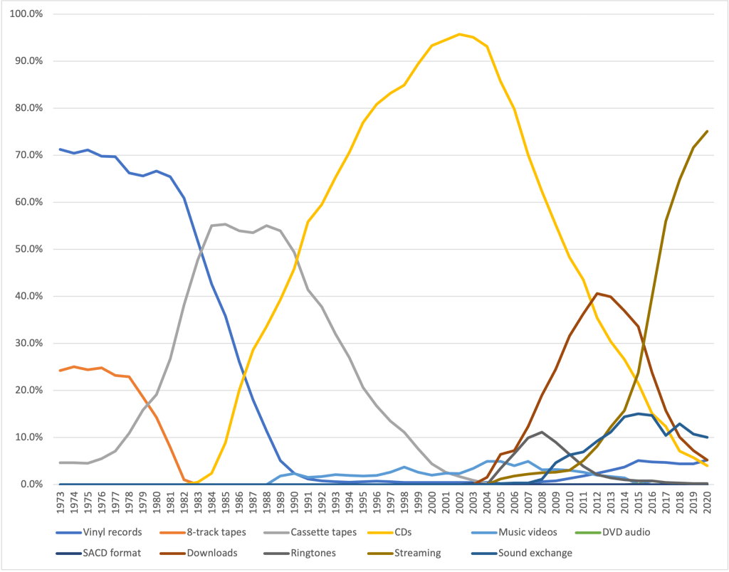 Listening to recorded music seems like a basic, uncomplicated activity, but as we discuss in the opening to Chapter 14, few markets have been as disrupted by technological change over the years as the market for recorded music. The following graph shows the distribution of revenue received by firms in the recording industry by type of music format. The data are first available for 1973.