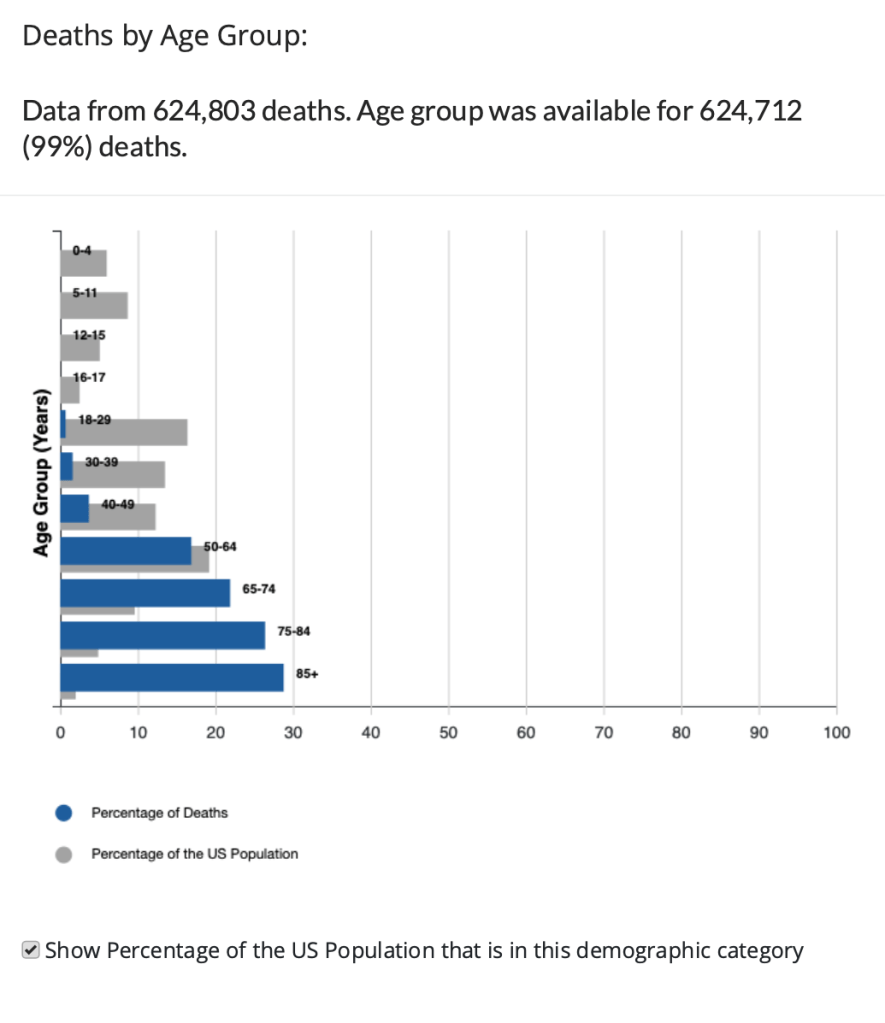 The blue bars show the percentage of total deaths from Covid since the beginning of the pandemic represented by that age group and the gray bars show the percentage that group makes up of the total U.S. population. Therefore, an age group that has a gray bar longer than its blue bar was proportionally less affected by the virus and an age group that has a blue bar longer its gray bar was proportionally more affected by the virus. The chart shows that people over age 65 experienced particularly high mortality rates. Strikingly, people over age 85 accounted for nearly 30 percent of all deaths in the United States, while making up only 2 percent of the U.S. population.