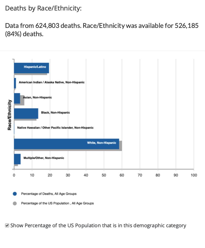 Medical researchers and epidemiologists have also not arrived at a consensus in explaining differences in mortality rates across racial or ethnic groups. Groups with higher mortality rates have had lower vaccination, which explains some of the difference. Groups with higher mortality rates are also more likely to suffer from other conditions, such as hypertension, that have been identified as contributing factors in some Covid deaths. These groups are also less likely to have access to health care than are the groups with lower mortality rates. The CDC notes that: “Race and ethnicity are risk markers for other underlying conditions that affect health, including socioeconomic status, access to health care, and exposure to the virus related to occupation, e.g., frontline, essential, and critical infrastructure workers.”