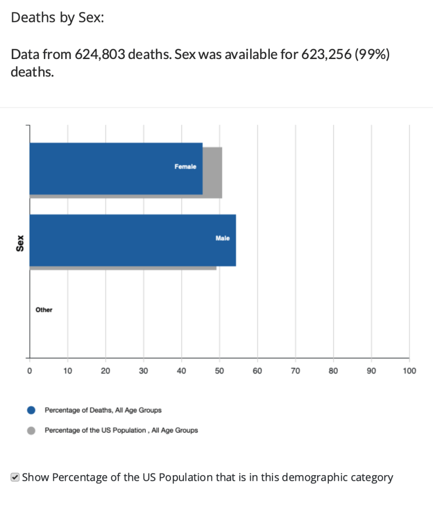 The following chart displays data on Covid deaths by gender. Men account for about 49 percent of the U.S. population but have accounted for about 54 percent of Covid deaths.