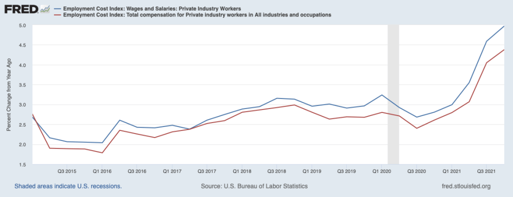 In his press conference following the December 2021 FOMC meeting, Chair Jerome Powell surprised some economists by discussing the importance of the employment cost index (ECI) in the committee’s evaluation of the current state of inflation. Powell was asked this question by a journalist: “I wonder if you could talk a little bit about what prompted your recent pivot toward greater wariness around inflation.” He responded, in part: