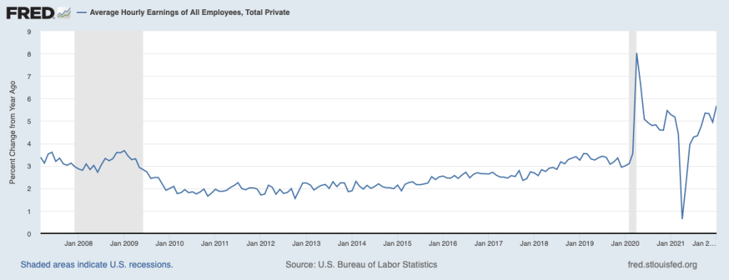 The link between wage inflation and price inflation. The monthly “Employment Situation” reports from the Bureau of Labor Statistics (BLS), in addition to providing data on payroll employment and the unemployment rate, also provide data on average hourly earnings (AHE). AHE are the wages and salaries per hour worked that private, nonfarm business pay workers. AHE don’t include the value of benefits that firms provide workers, such as contributions to 401(k) retirement accounts or health insurance. The following figure shows changes in AHE from the same month in the previous year. The figure shows that since the Covid-19 pandemic first began to affect the U.S. economy in March 2020, AHE have moved erratically. But since the fall of 2021, growth in AHE has been consistently above the 2 percent to 4 percent range that prevailed in the years after the end of the Great Recession of 2007–2009.