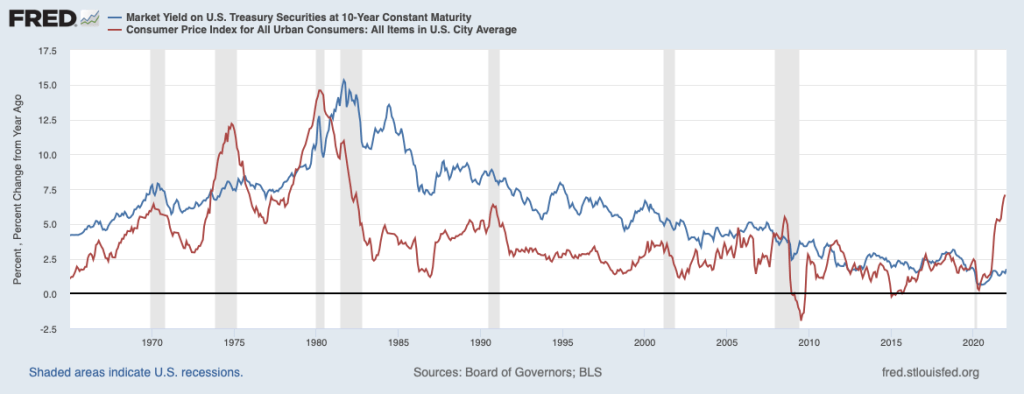 Source: Sam Goldfarb, “Elevated Bond Yields Approach Key Milestone,” Wall Street Journal, February 7, 2022; U.S. Bureau of Economic Analysis, “Prices, Costs, and Profit per Unit of Real Gross Value Added of Nonfinancial Domestic Corporate Business,” January 27, 2022; and Federal Reserve Bank of St. Louis.