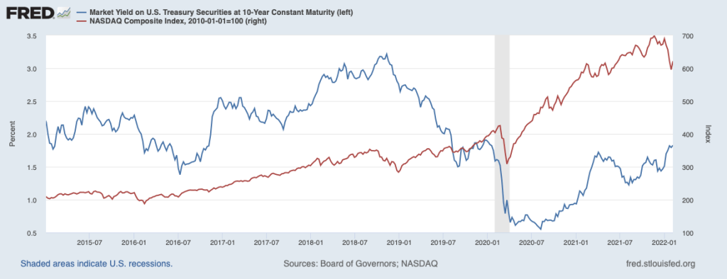 The following figure shows the interest rate on the 10-year Treasury note (blue line with scale given on the left) and the values of the Nasdaq composite stock index (red line with the value for January 1, 2010 set equal to 100 and the scale given on the right). The Nasdaq includes the stocks of more tech firms than is true of the other widely followed stock market indexes—the S&P 500 and the Dow Jones Industrial Average. The figure shows that the declining interest rate on 10-year Treasury notes that began in late 2018 and continued through mid-2020 coincided with increases in the prices of the stocks in the Nasdaq index—apart from the spring of 2020 during the beginning of the Covid-19 pandemic.  The most recent period shows that increases in the interest rate on the 10-year Treasury note have corresponded with a decline in the Nasdaq, as noted in the article.