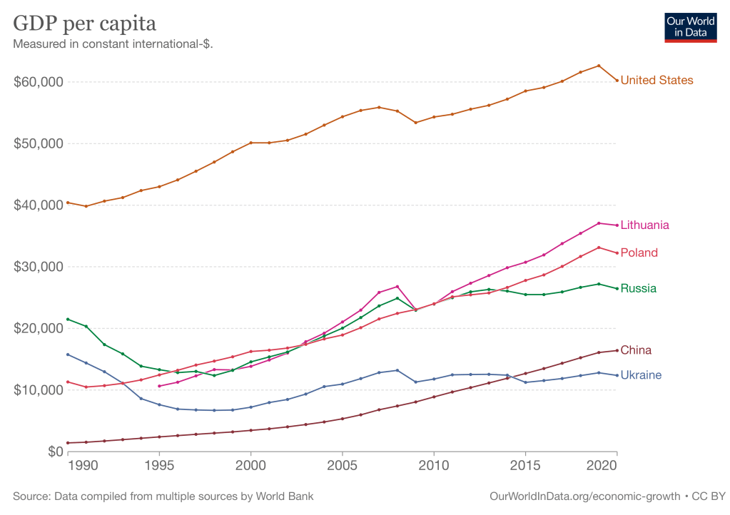 In 2020, Russian GDP per capita was less than half that of U.S. GDP per capita although about 50 percent greater than GDP per capita in China. GDP per capita in Lithuania, part of the Soviet Union until 1991, and Poland, part of the Soviet bloc until 1989, are significantly higher than in Russia. These two countries have become integrated into the European economy and have grown more rapidly than has Russia, which continues to rely heavy on exports of oil, natural gas, and other commodities. Ukraine is not as well integrated into the European economy as are Poland and Lithuania and Ukraine experienced little economic growth since attaining independence in 1991. In fact, Ukraine’s real GDP per capita was lower in 2020 than it had been in 1991.