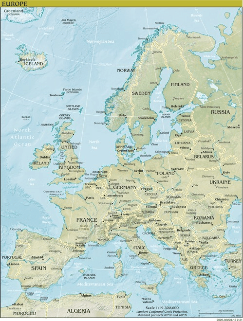A map of Europe with Ukraine in the middle right below Belarus and to the east of Poland.