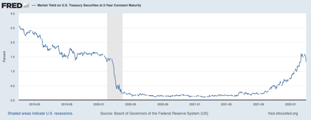 On March 2, 2022, as the conflict between Russia and Ukraine intensified, an article in the Wall Street Journal had the headline “Investors Pile Into Treasurys as Growth Concerns Flare.” The article noted that: “The 10-year Treasury yield just recorded its largest two-day decline since March 2020, while two-year Treasury yields plunged the most since 2008.”