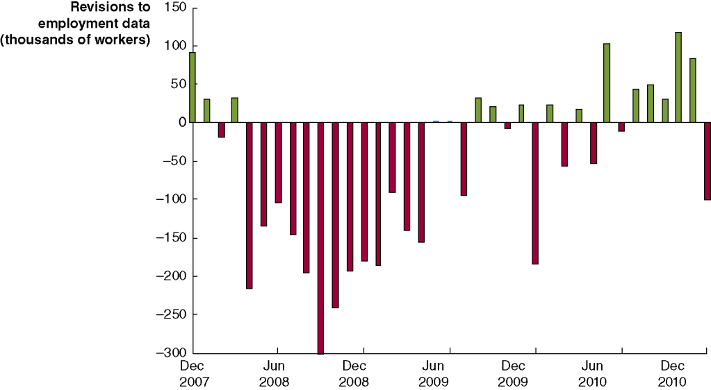 In Macroeconomics, Chapter 9, Section 9.1 (Economics, Chapter 19, Section 19.1), we give an example of substantial revisions in the employment data. Figure 9.5 (reproduced below) shows that the declines in employment during the 2007–2009 recession were initially greatly underestimated. For example, the BLS initially reported that employment declined by 159,000 during September 2008. But after additional data became available, the BLS revised its estimate to a much larger decline of 460,000.