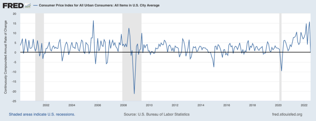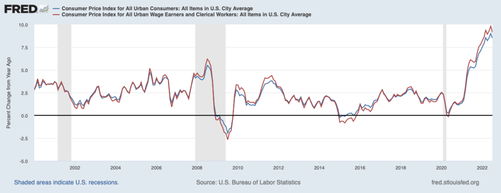Sources: Anne Tergesen, “Social Security Benefits Are Heading for the Biggest Increase in 40 Years,” Wall Street Journal, August 10, 2022; Neil Irwin, “Inflation Drops to Zero in July Due to Falling Gas Prices,” axios.com, August 10, 2022; “Consumer Price Index Frequently Asked Questions,” bls.gov, March 23, 2022; Stephen B. Reed and Kenneth J. Stewart, “Why Does BLS Provide Both the CPI–W and CPI–U?” U.S. Bureau of Labor Statistics, Beyond the Numbers, Vol. 3, No. 5, February 2014; “Latest Cost of Living Adjustment,” ssa.gov; and Federal Reserve Bank of St. Louis.