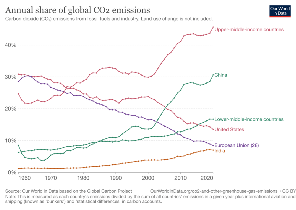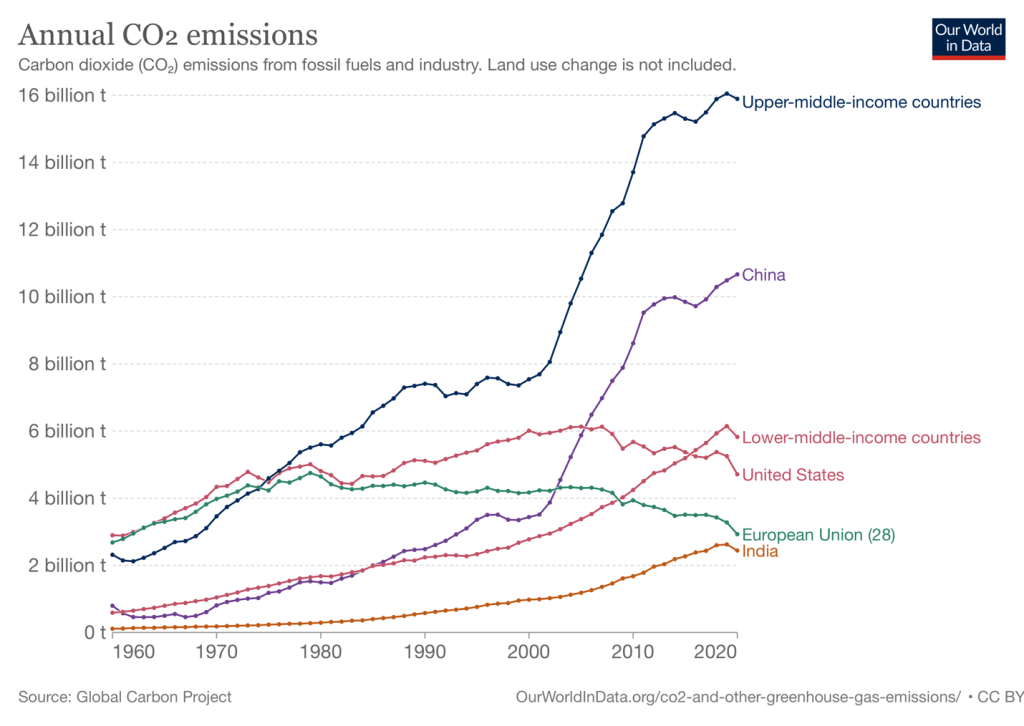 The first of the following figures shows for the years 1960 to 2020, the total amount of CO2 emissions by the United States, China, India, the 28 countries in the European Union, lower-middle-income countries (including India, Nigeria, and Vietnam), and upper-middle-income countries (including China, Brazil, and Argentina). The second of the figures shows the percentage of total world CO2 accounted for by each of the three individual countries and by the indicated groups of countries. in the United States and in the countries of the European Union both total emissions and the percentage of total world emissions have been declining over the past 15 years. Emissions have been increasing in China, India, and in middle-income countries. The figures are from the Our World in Data website (ourworldindata.org). (Note that the reductions in emissions during 2020 largely reflect the effects of the slowdown in economic activity as a result of the Covid-19 pandemic rather than long-term trends in emissions.)