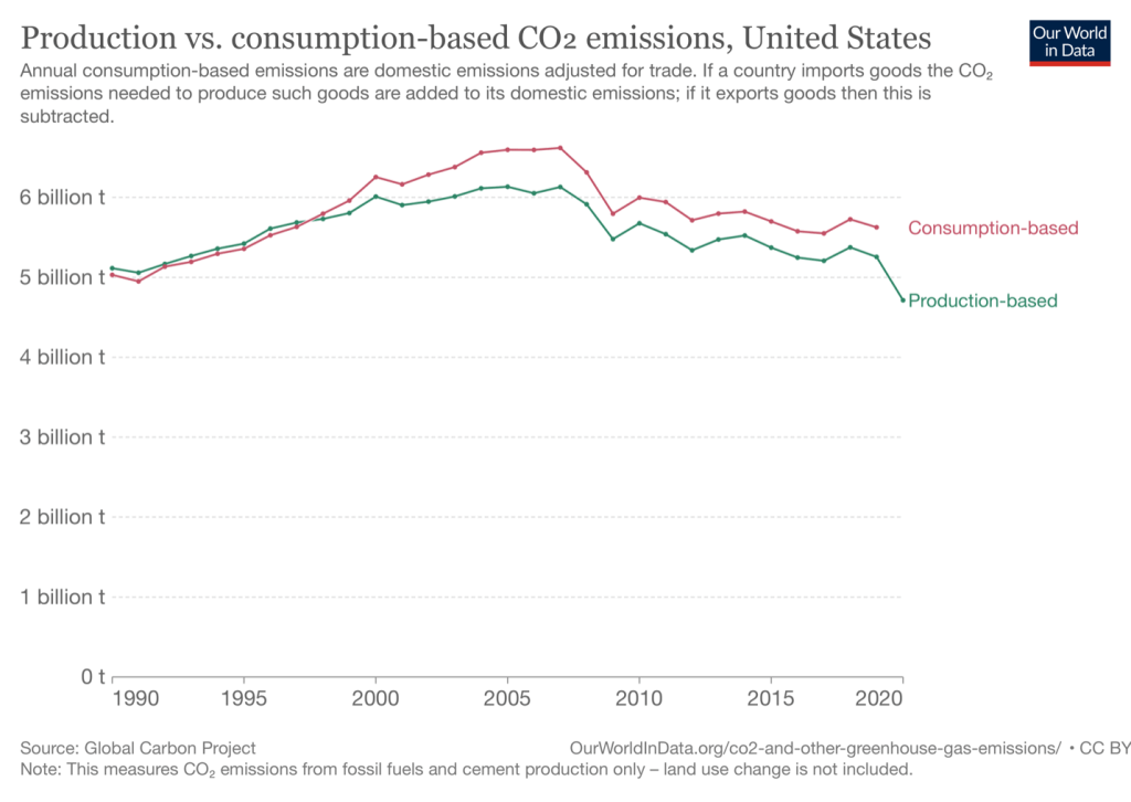 The two figures above measure a country’s contribution to CO2 emissions by looking at the quantity of emissions generated by production within the country. But suppose instead that we look at the quantity of CO2 emitted during the production of the goods consumed within the country? In that case, we would allocate to the United States CO2 emitted during the product of a good, such as a television or a shirt, that was produced in China or another foreign country but consumed in the United States.