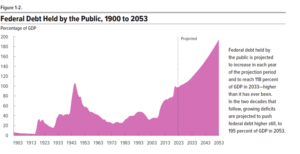 The following figure is reproduced from the CBO report. It shows the ratio of debt to GDP with actual values for the period 1900-2022 and projected values for the period 2023-2053. Note that the only other time the ratio of debt to GDP rose above 100 percent was in 1945 and 1946 as a result of the large increases in federal government spending required to fight World War II.