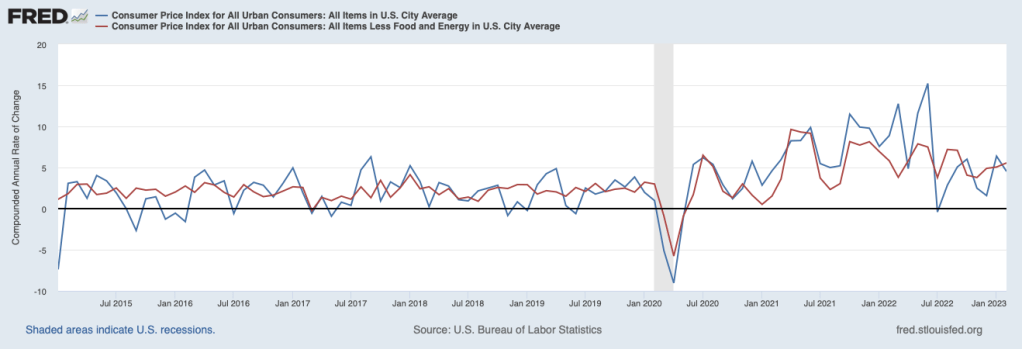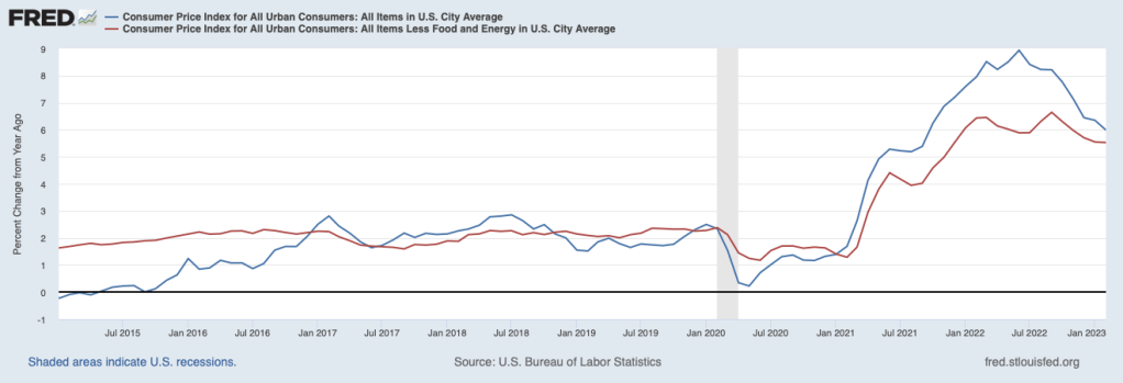 This morning (Tuesday, March 14, 2023), the Bureau of Labor Statistics (BLS) released its data on the consumer price index for February. The following figure show inflation as measured by the percentage change in the CPI from the same month in the previous year (which is the inflation measurement we use most places in the text) and as the percentage change in core CPI, which excludes prices of food and energy. (The inflation rate computed by the percentage change in the CPI is sometimes referred to as headline inflation.) The figure shows that although inflation has slowed somewhat it is still well above the Fed’s 2 percent target. (Note that, formally, the Fed assesses whether it has achieved its inflation target using changes in the personal consumption expenditures (PCE) price index rather than using changes in the CPI. We discuss issues in measuring inflation in several blog posts, including here and here.)