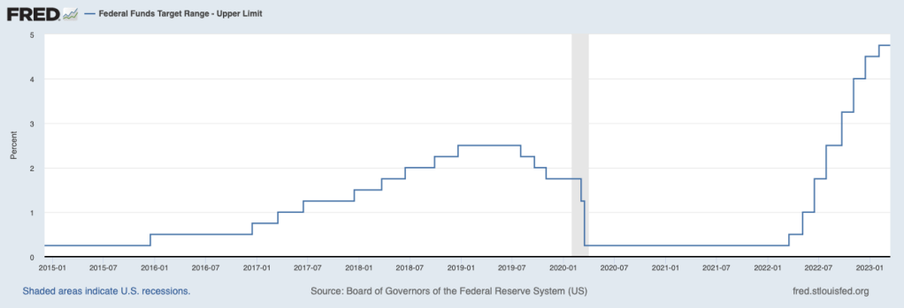 Since March 2022, the Fed has been rapidly increasing its target for the federal funds rate in order to slow the growth in aggregate demand and bring down the inflation rate, which has been well above the Fed’s target of 2 percent. (We discuss monetary policy in a number of earlier blog posts, including here and here, and in podcasts, the most recent of which (from February) can be found here.) The target federal funds rate has increased from a range of 0 percent to 0.25 percent in March 2022 to a range of 4.5 percent to 4.75 percent. The following figure shows the upper range of the target for the federal funds rate from January 2015 through March 14, 2023.