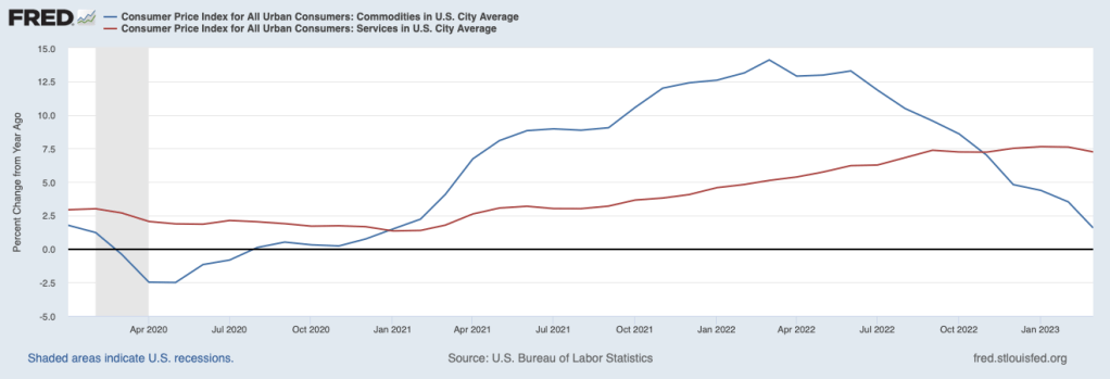 During the period from January 2021 to November 2022, inflation in goods was higher—often much higher—than inflation in services. The high rates of inflation in goods were partly the result of disruptions to supply chains resulting from the Covid-19 pandemic and partly due to a surge in demand for goods as a result of very expansionary fiscal and monetary policies. Since November 2022, inflation in the prices of services has remained high, while inflation in the prices of goods has continued to decline. In March, goods inflation was only 1.6 percent, while services inflation was 7.2 percent. In his press conference following the last FOMC meeting, Fed Chair Jerome Powell stated that as long as services inflation remains high “it would be very premature to declare victory [over inflation] or to think that we’ve really got this.” (The transcript of Powell’s news conference can be found here.) This statement coupled with the latest data on service inflation would seem to indicate that Powell will be in favor of another 0.25 percentage point increase in the federal funds rate target range.