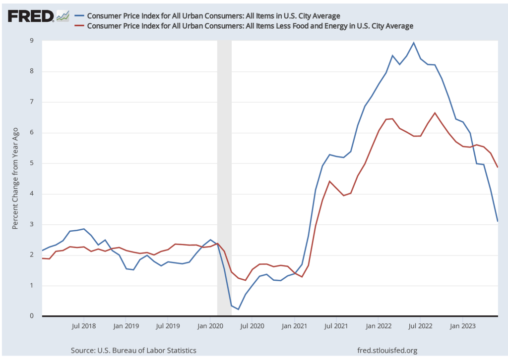PCE inflation peaked at 7.0 percent in June 2022 and had fallen to 2.9 percent in June 2023. Core PCE had a lower and earlier peak of 5.4 percent in February 2023, but had experienced a smaller decline—to 4.1 percent in June 2023. Inflation as measured by the consumer price index (CPI) followed a similar pattern, as shown in the following figure. Inflation measured by core CPI reached a lower peak than did inflation measured by the CPI and declined by less through June 2023.