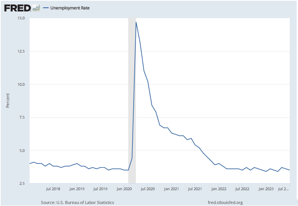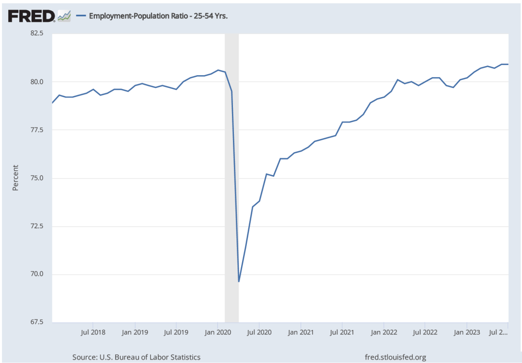 As inflation has been falling since mid-2022, , the unemployment rate has remained low and the employment-population ratio for prime-age workers (workers aged 25 to 54) has risen above its 2019 pre-pandemic peak, as the following two figures show.