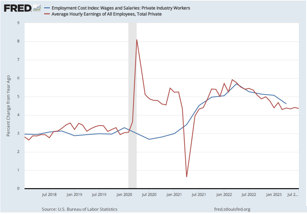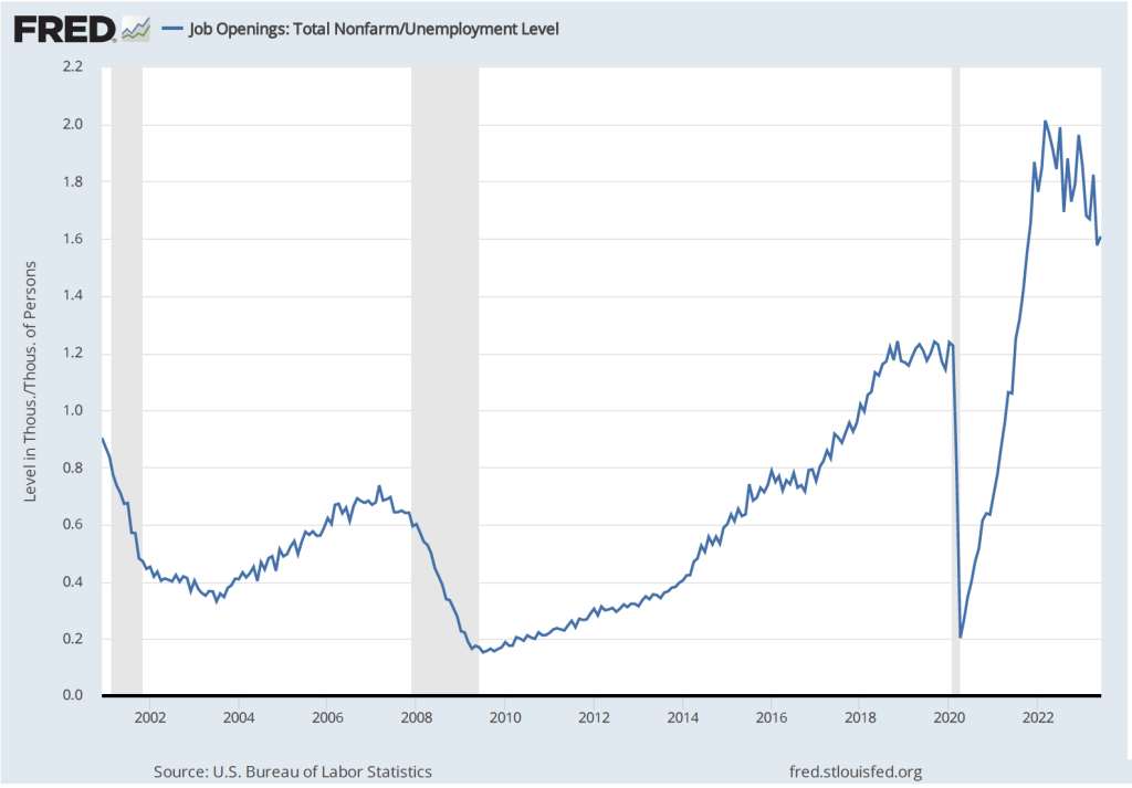 1. As shown in the following two figures, the labor market remains tight, with wage increases remaining high—although slowing in recent months—and the ratio of job openings to the number of unemployed workers remaining at historic levels—although that ratio has also been declining in recent months. If the labor market remains very tight, wages may continue to rise at a rate that isn’t consistent with 2 percent inflation. In that case, the FOMC may have to persist in raising its target for the federal funds rate, increasing the chances for a recession.