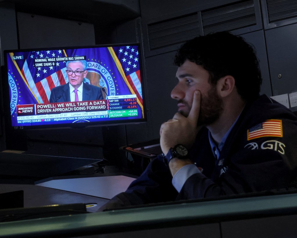 A trader on the New York Stock Exchange listtening to Fed Chair Jerome Powell (from Reuters via the New York Times)