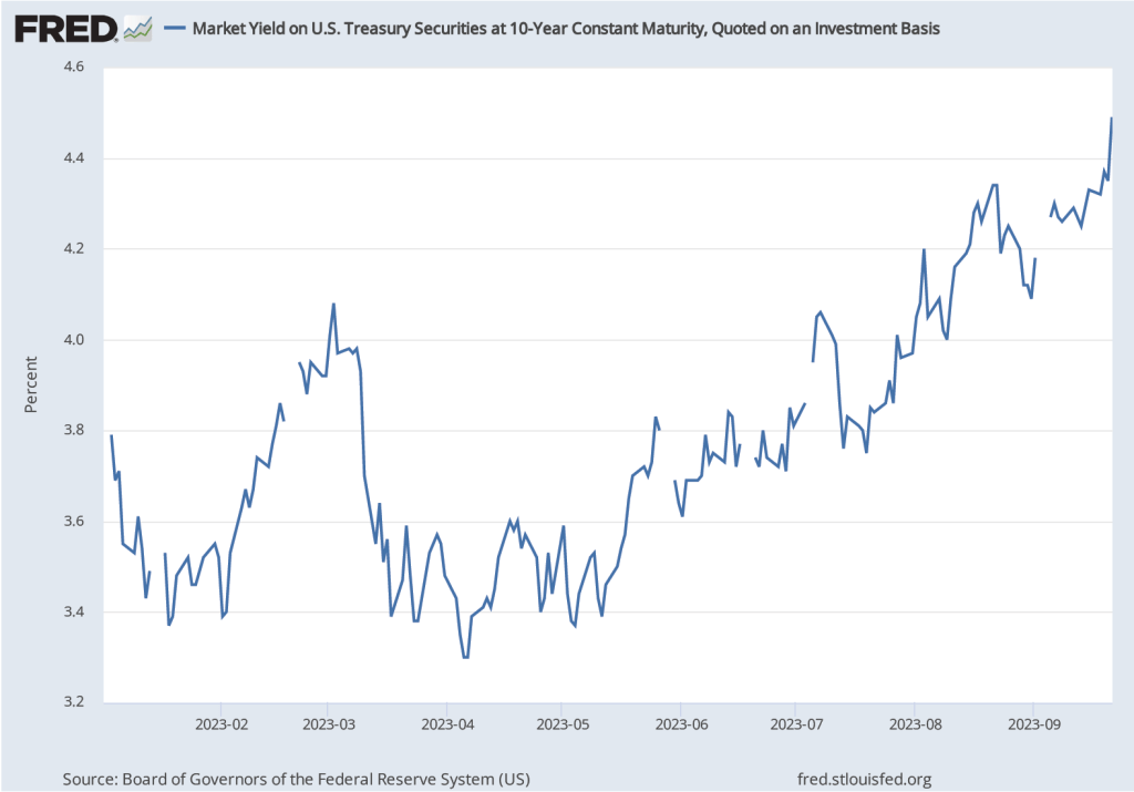 We see a similar pattern in the bond market. Recall that when the price of bonds declines in the bond market, the interest rates—or yields—on the bonds increase. As the following figure shows, the interest rate on the 10-year Treasury note rose from 4.37 percent on September 19 to 4.49 percent on September 21. The 10-year Treasury note plays an important role in the financial system, influencing interest rates on mortgages and corporate bonds. So, the yield on the 10-year Treasury note increasing from 3.3 percent in the spring of 2023 to 4.5 percent following the FOMC meeting has the effect of increasing long-term interest rates throughout the U.S. economy.