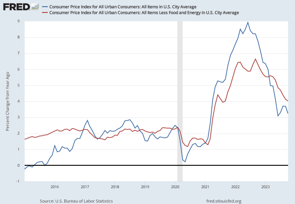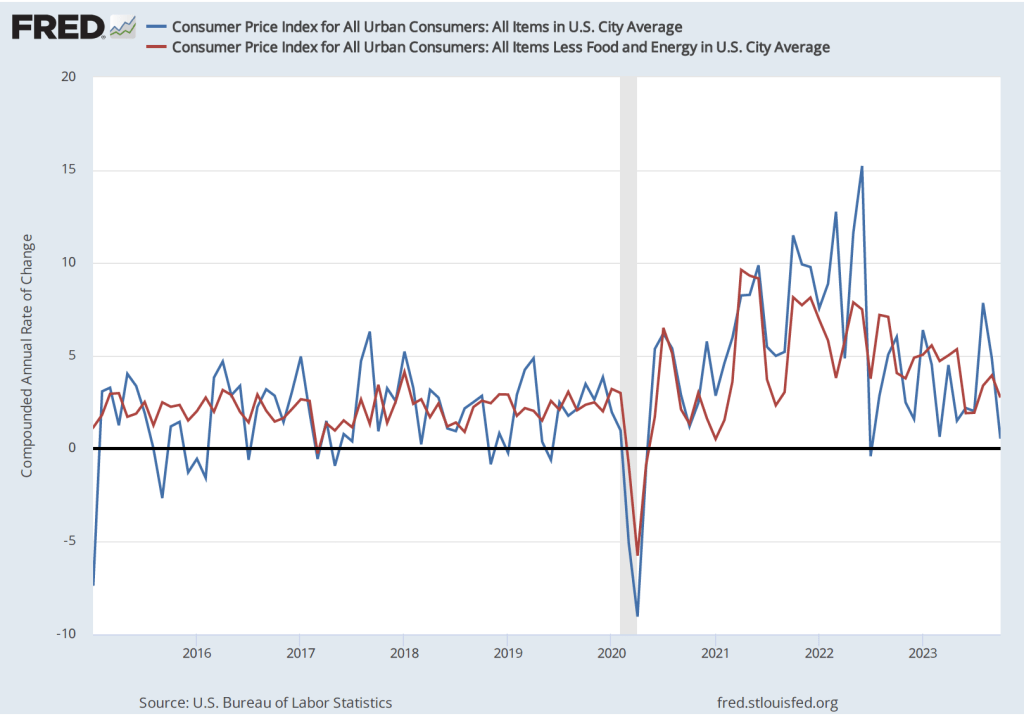 The inflation rate for the CPI declined from 3.7 percent in September to 3.2 percent in October. Core CPI declined from 4.1 percent in September to 4.0 percent in October. So, measured this way, inflation declined substantially when measured by the CPI including prices of all goods and services but only slightly when measured using core CPI.