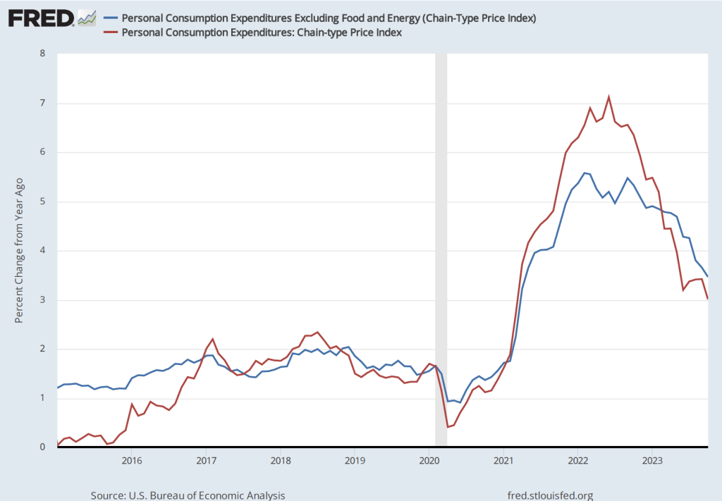 PCE inflation declined from 3.4 percent in September to 3.0 percent in October. Core PCE inlation declined from 3.8 percent in September to 3.5 percent in September. Although inflation has been declining from its peak in mid-2022, both of these measures of inflation remain above the Fed’s 2 percent target.