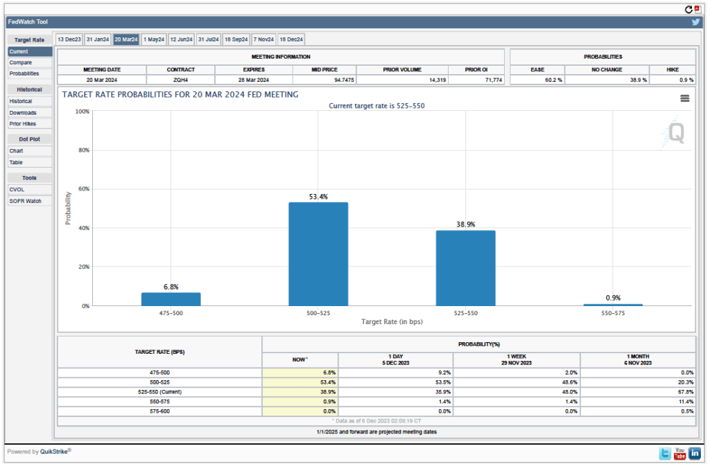 Futures markets allow investors to buy and sell futures contracts on commodities–such as wheat and oil–and on financial assets. Investors can use futures contracts both to hedge against risk—such as a sudden increase in oil prices or in interest rates—and to speculate by, in effect, betting on whether the price of a commodity or financial asset is likely to rise or fall. (We discuss the mechanics of futures markets in Chapter 7, Section 7.3 of Money, Banking, and the Financial System.) The CME Group was formed from several futures markets, including the Chicago Mercantile Exchange, and allows investors to trade federal funds futures contracts. The data that result from trading on the CME indicate what investors in financial markets expect future values of the federal funds rate to be. The following chart from the CME’s FedWatch Tool shows values after trading of federal funds futures on December 5, 2023.