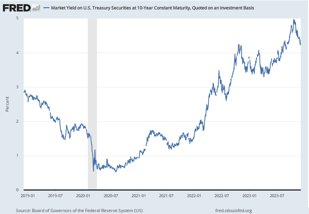 One other indication from financial markets that investors expect that the U.S. economy is likely to slow during 2024 is given by movements in the interest rate on the 10-year U.S. Treasury note. As shown in the following figure, from August to October of this year, the interest rate on the 10-year Treasury note rose from less than 4 percent to nearly 5  percent—an unusually large change in such a short period of time. Since then, most of that increase has been reversed with the interest rate on the 10-year Treasury note having fallen below 4.2 percent in early December