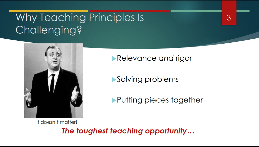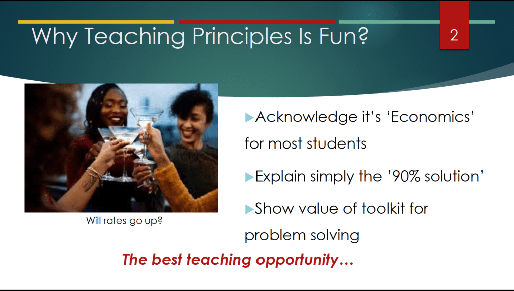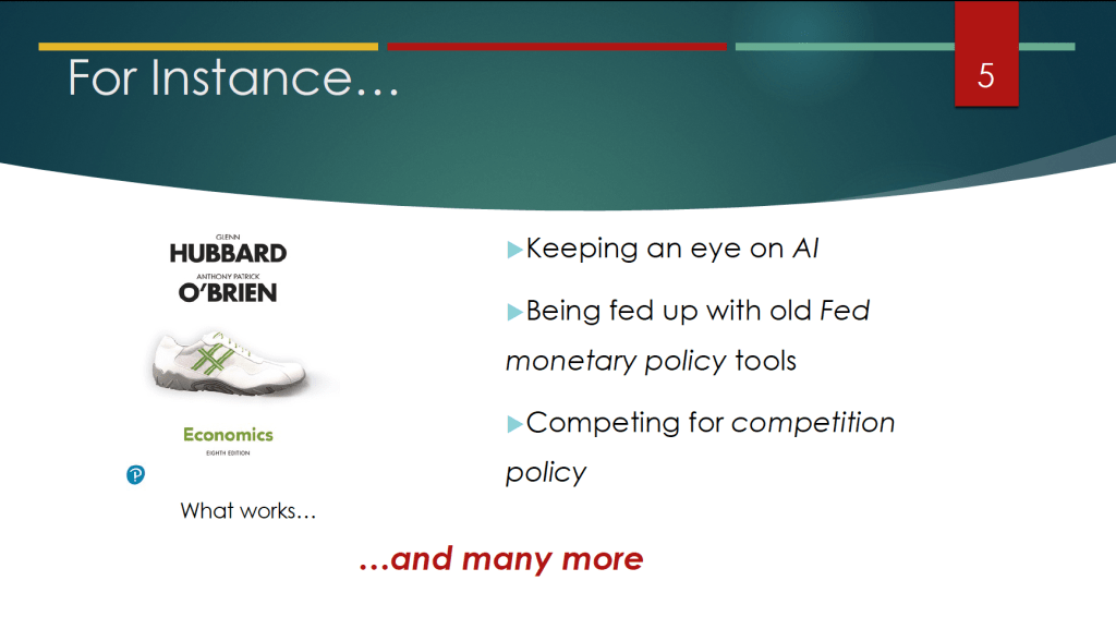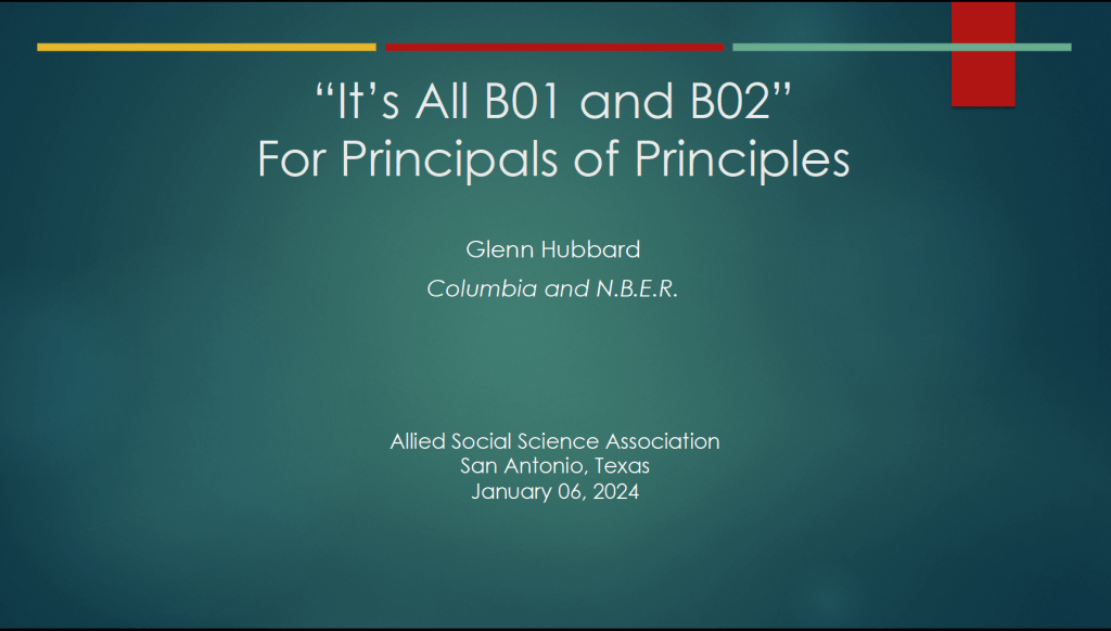 Glenn prepared some slides for his presentation. Note that “B01″ and B02” were the titles when he first taught principles of economics as an assistant professor at Northwestern. (We won’t mention how long ago that was!)