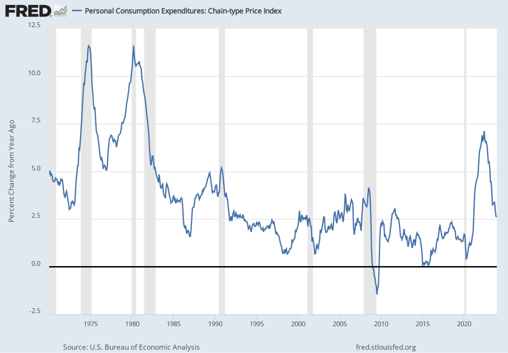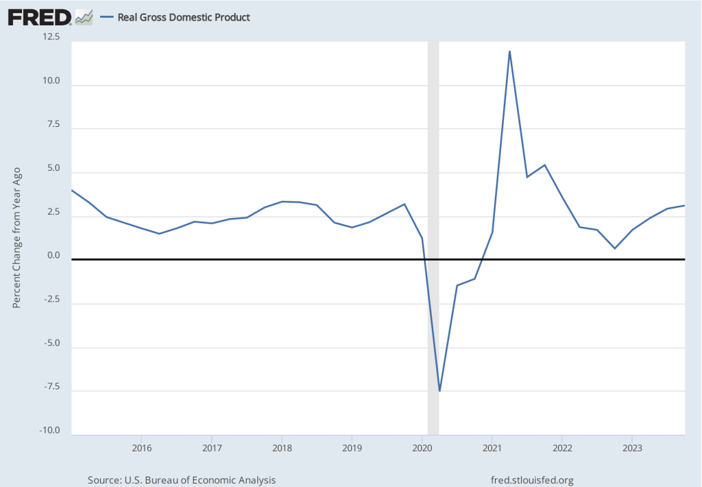 The following figure shows for each quarter since the beginning of 2015, the growth rate of real GDP measured as the percentage change from the same quarter in the previous year. The figure indicates that although real GDP growth dropped to below 1 percent in the fourth quarter of 2022, the growth rate rose during each quarter of 2023. The growth rate of 3.1 percent in the fourth quarter of 2023 remained well above the FOMC’s 1.8 percent estimate of long-run economic growth. (The average of the members of the FOMC’s estimates of the long-run growth rate of real GDP can be found here.) To this point, there is no indication from the GDP data that the U.S. economy is in danger of experiencing a recession in the near future.