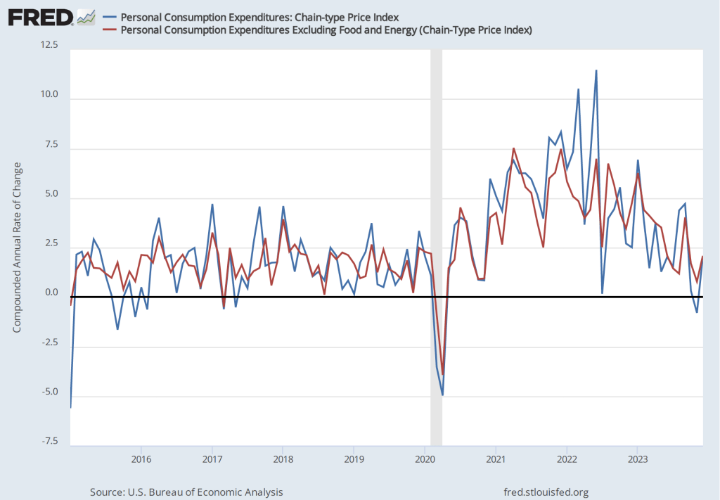 By the time inflation reached its peak in mid-2022, many economists believed that the FOMC’s decision to delay increasing the federal funds rate until March 2022 had made it unlikely that the Fed could return inflation to 2 percent without causing a recession. But the latest macroeconomic data indicate that—contrary to that expectation—the Fed does appear to have come very close to achieving a soft landing. On January 26, the Bureau of Economic Analysis (BEA) released data on the PCE for December 2023. The following figure shows for the period since 2015, inflation as measured by the percentage change in the PCE from the same month in the previous year (the blue line) and as measured by the percentage change in the core PCE, which excludes the prices of food and energy (the red line).