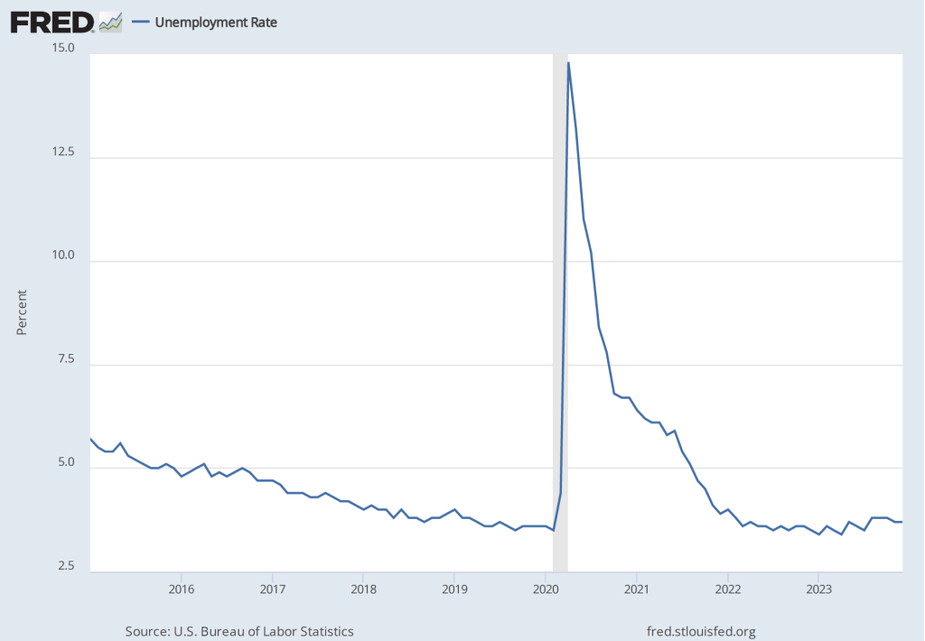 The labor market also shows few signs of a recession, as indicated by the following figure, which shows the unemployment rate in the months since January 2015. The unemployment rate has remained below 4 percent in each month since December 2021. The unemployment rate was 3.7 percent in December 2023, below the FOMC’s projection of a long-run unemployment rate of 4.1 percent.