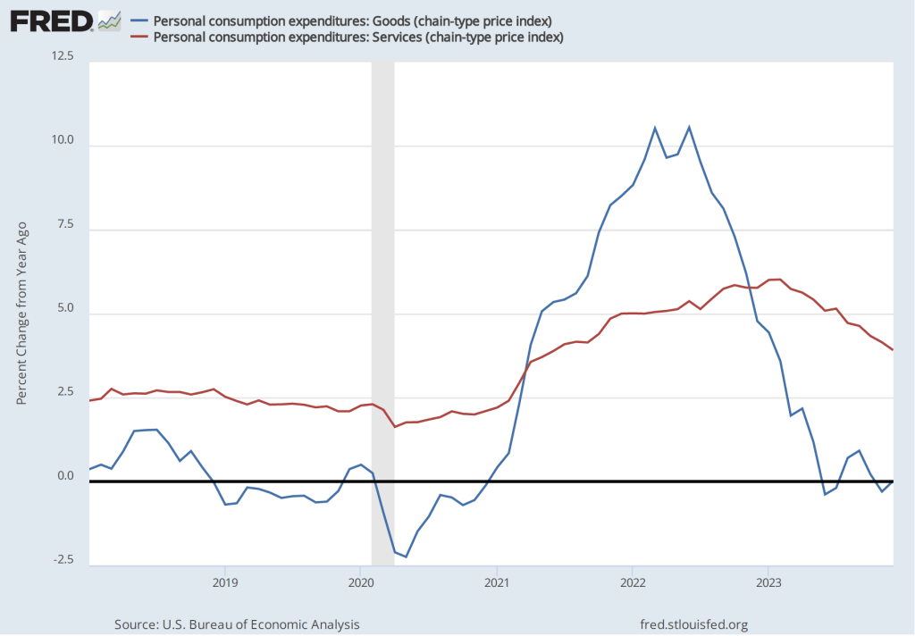 Powell highlighted a couple of areas of potential concern. The Fed gauges its progress towards achieving its 2 percent inflation goal using the percentage change in the personal consumption expenditures (PCE) price index. As we noted in a recent post, PCE inflation has declined from a high of 7.1 percent in June 2022 to 2.9 percent in December 2023. But Powell noted that PCE inflation in goods has followed a different path from PCE inflation in services, as the following figure shows.