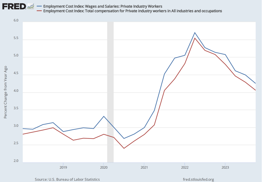 Powell also noted that the most recent data on the employment cost index (ECI) had been released the morning of the meeting. The ECI is compiled by the Bureau of Labor Statistics and is published quarterly. It measures the cost to employers per employee hour worked. The BLS publishes data that includes only wages and salaries and data that includes, in addition to wages and salaries, non-wage benefits—such as contributions to retirement accounts or health insurance—that firms pay workers. The figure below shows the percentage change from the same month in the previous year for the ECI including just wages and salaries (blue line) and for the ECI including all compensation (red line). Although ECI inflation has declined significantly from its peak in he second quarter of 2022, in the fourth quarter of 2023, both measures of ECI inflation were above 4 percent. Wages increasing at that pace may not be consistent with a 2 percent rate of price inflation.