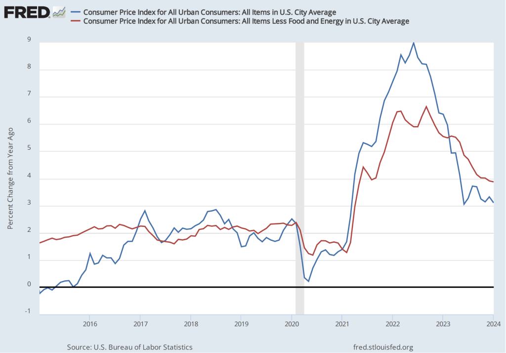 The BLS’s release today (February 13) of its report on the consumer price index (CPI) (found here) for January provided additional evidence that the Fed may not yet have put inflation on a firm path back to its 2 percent target. The average forecast of economists surveyed before the release of the report was that the increase in the version of the CPI that includes the prices of all goods and services in the market basket—often called headline inflation—would be 2.9 percent. (We discuss how the BLS constructs the CPI in Macroeconomics, Chapter 9, Section 19.4, Economics, Chapter 19, Section 19.4, and Essentials of Economics, Chapter 3, Section 13.4.) As the following figure shows, headline inflation for January was higher than expected at 3.1 percent (measured by the percentage change from the same month in the previous year), while core inflation—which excludes the prices of food and energy—was 3.9 percent. Headline inflation was lower than in December 2023, while core inflation was almost unchanged.