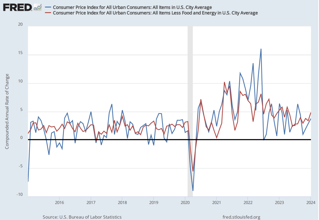 Although the values for January might seem consistent with a gradual decline in inflation, that conclusion may be misleading. Headline inflation in January 2023 had been surprisingly high at 6.4 percent. Hence, the comparision between the value of the CPI in January 2024 with the value in January 2023 may be making the annual CPI inflation rate seem artificially low. If we look at the 1-month inflation rate for headline and core inflation—that is the annual inflation rate calculated by compounding the current month’s rate over an entire year—the values are more concerning, as indicated in the following figure. Headline CPI inflation is 3.7 percent and core CPI inflation is 4.8 percent.